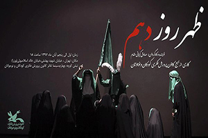 در نمایش «ظهر روز دهم» طلب آب حضرت سکینه از حضرت عباس (ع) و مبارزه و شهادت ایشان در نبرد حق علیه باطل یکی از پردههای نمایش است و وداع امام حسین (ع) مبارزه و شهادت ایشان در پرده دوم و و قصهی بازماندگان کاروان امام و سختیها و رنجهای اهل بیت پس از فاجعه کربلا در پرده آخر به نمایش گذاشته میشود.