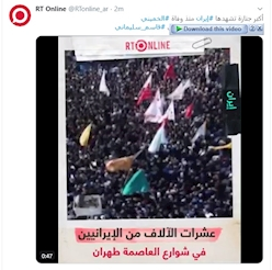 روسیا الیوم تصاویر حضور انبوه مردم عزادار ایران را در مراسم تشییع سردار شهید قاسم سلیمانی منتشر کرد