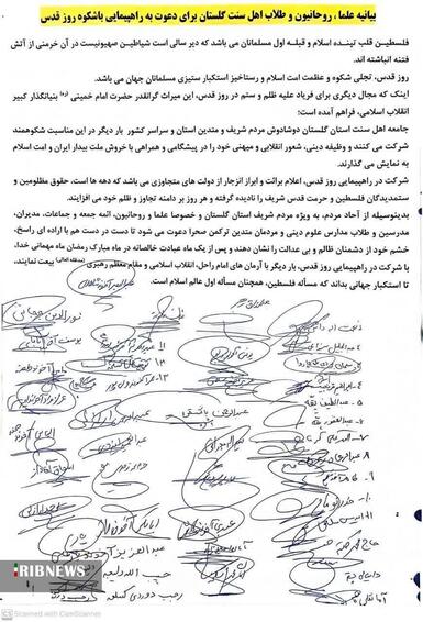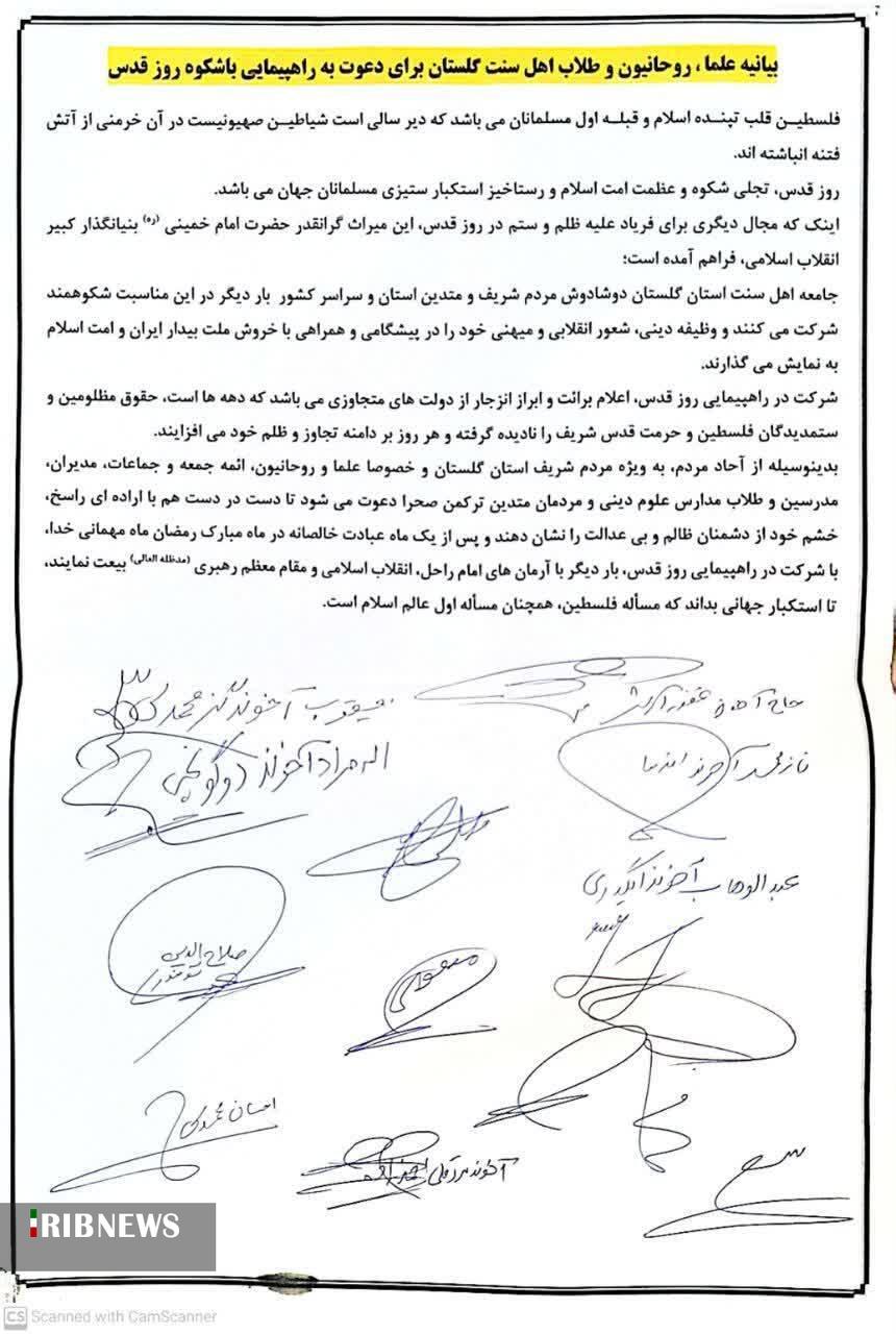 علما، روحانیان و طلاب اهل سنت گلستان، با صدور بیانیه ایی مردم را برای حضور پرشکوه در راهپیمایی روز قدس دعوت کردند.