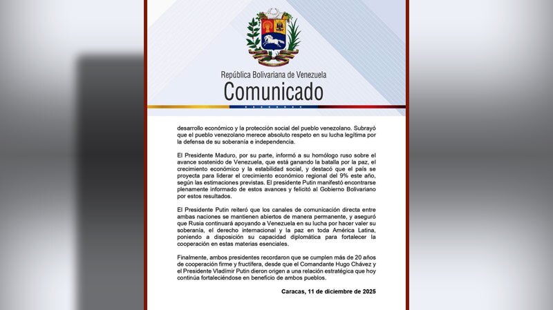 پوتین با تأکید بر اینکه مردم ونزوئلا در مبارزه مشروع خود برای دفاع از حاکمیت و استقلال، شایسته احترام مطلق هستند، افزود: روسیه همچنان به حمایت از ونزوئلا در مسیر اعمال حاکمیت ملی، دفاع از حقوق بینالملل و برقراری صلح در آمریکای لاتین ادامه خواهد داد.